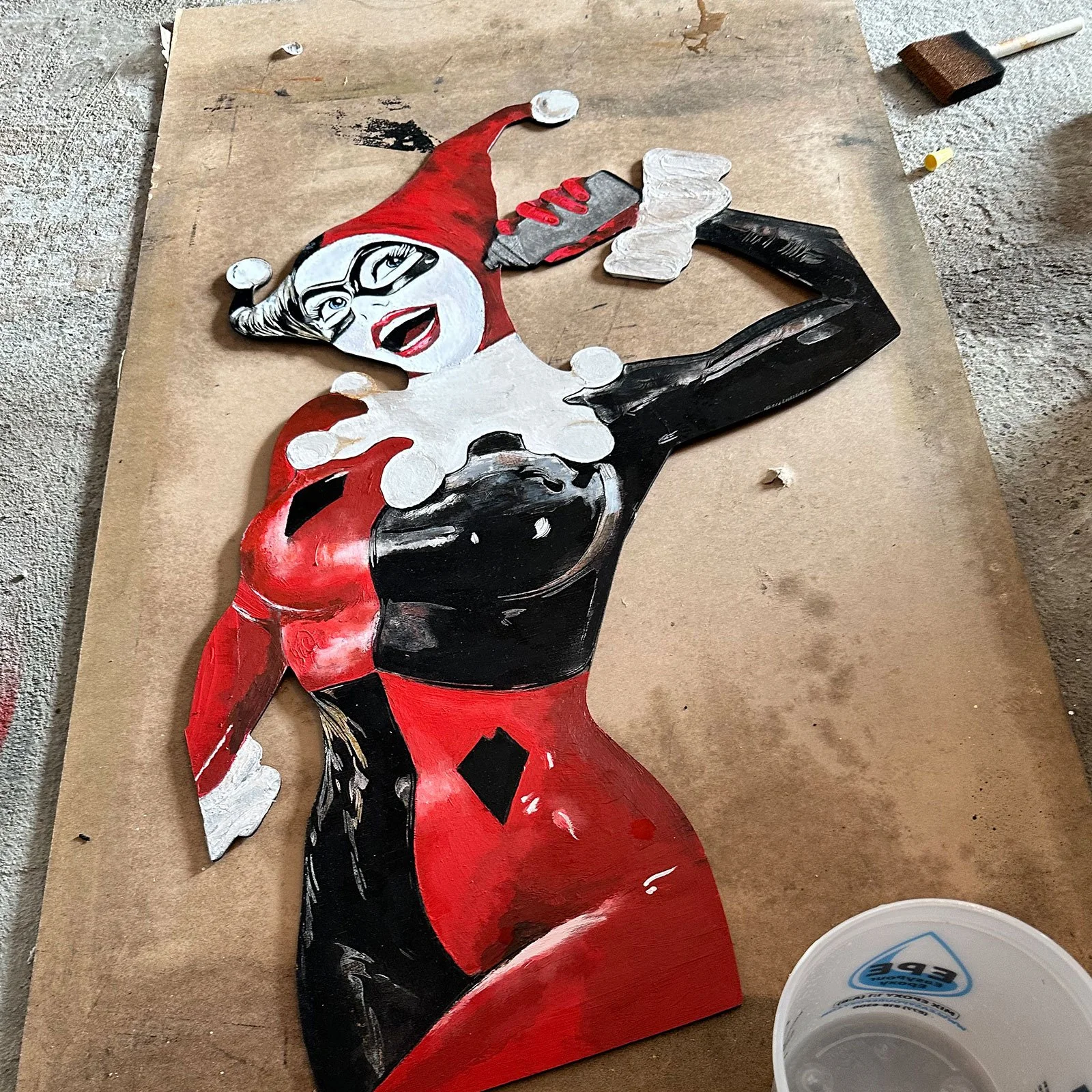 What began as a hand-sketched and painted Harley Quinn on birch evolved into multiple versions of the same idea. The original piece was cut out, layered with plexiglass, and painted with acrylics and spray for texture and energy. Later versions reimagine that work as archival prints, cut and sealed between plexiglass with epoxy to create a layered, almost sculptural surface. Each version is then finished with bold embellishments and graffiti artist HystaOne’s raw tag—giving the polished image an edge of unpredictability.